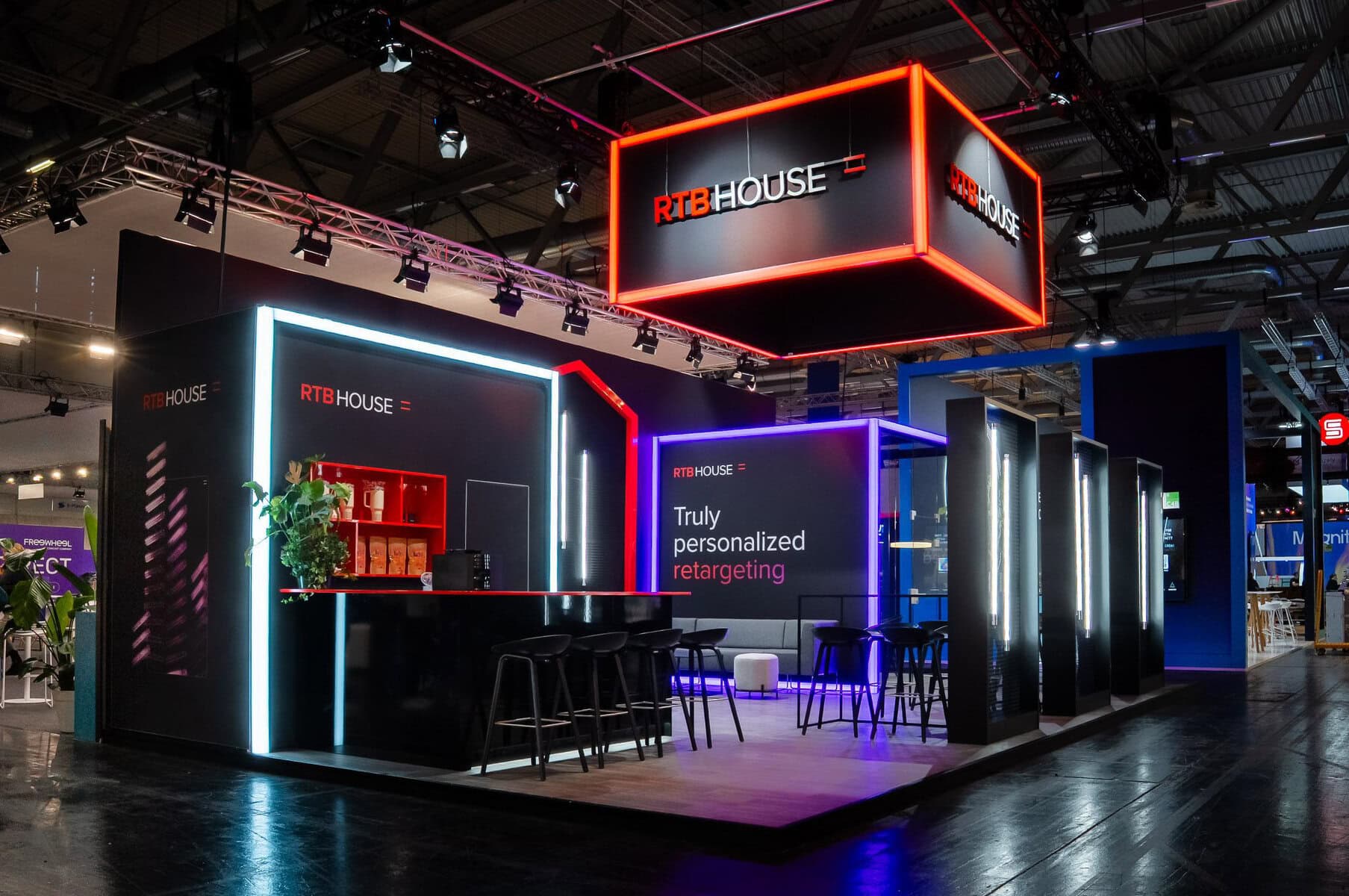 Für RTB House verfolgte wir einen völlig anderen Ansatz. Hier lautete die Aufgabe: Persönlichkeit sichtbar machen – ganz nach dem Kunden-Slogen „Truly personalized“. Die Lösung: Beleuchtete LED-Frames, die sich per Knopfdruck verändern ließen, zogen Aufmerksamkeit auf sich, ohne aufdringlich zu sein. Welche Farbe soll es sein? Unser Kunde hatte großen Spaß daran die Leucht Frames je nach Tageszeit und Stimmung andersfarbig leuchten zu lassen. Ein simples technisches Feature, das wie ein Magnet wirkte: Menschen blieben stehen, weil der Stand quasi interagierte.