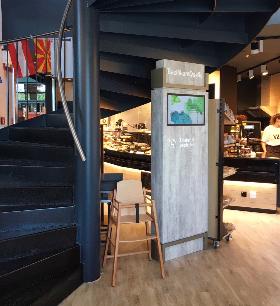 From the market level, a media stele guides customers to the visitor center on the roof. From there, they can experience the basil farm live. A large monitor gives customers an insight into the fish farm. Moreover, they can learn about REWE’s new Green Farming concept via information desks, some of which are media-supported. Here, too, the dominant material larch is consistently used in the furnishing elements.