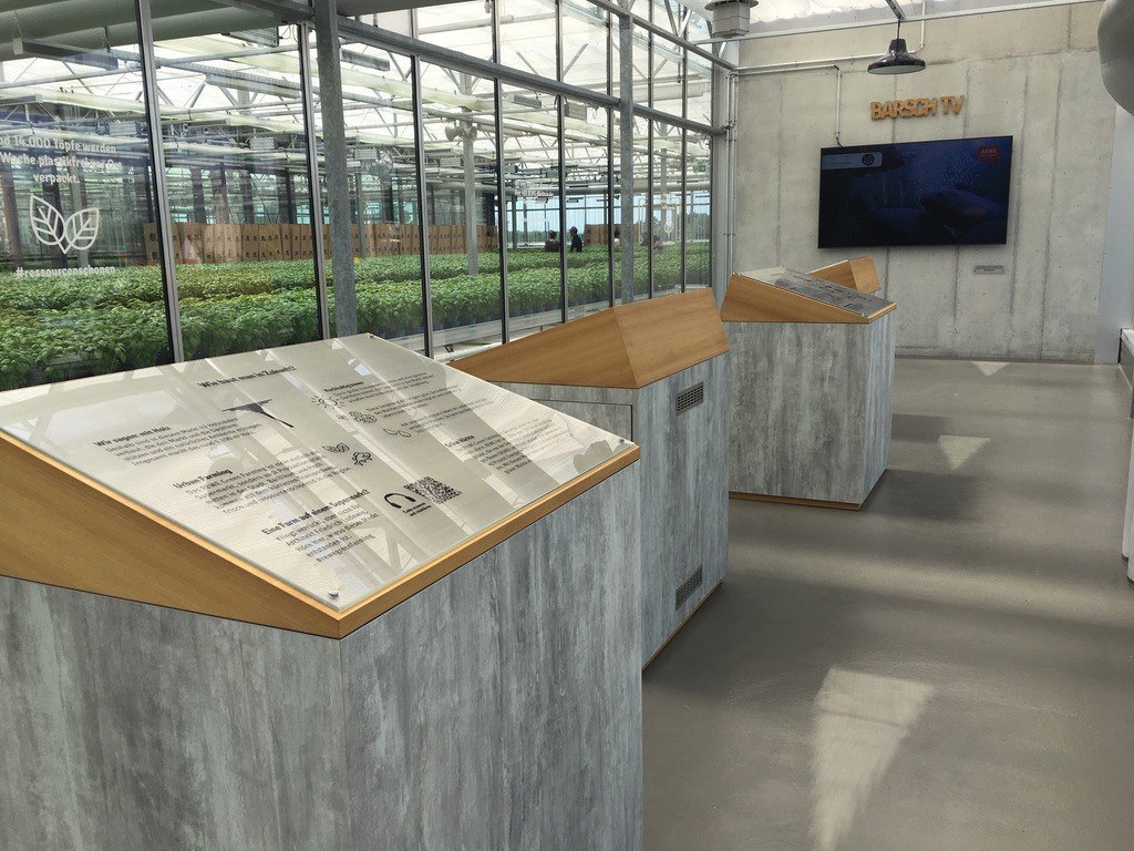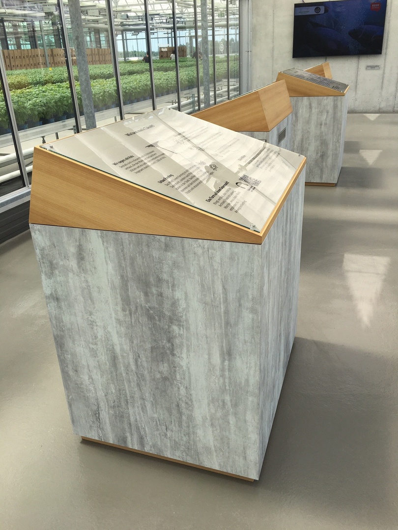 Von der Marktebene leitet eine Media-Stele die Kunden in das Besucherzentrum auf dem Dach. Dort können sie die Basilikumfarm live erleben. Über einen Großmonitor erhalten die Kunden Einblick in die Fischzucht. Außerdem können sie sich über zum Teil mediengestützte Informationspulte über das neue REWE Konzept Green Farming informieren. Auch hier ist das dominante Material Lärche konsequent bei den Ausstattungselementen eingesetzt.